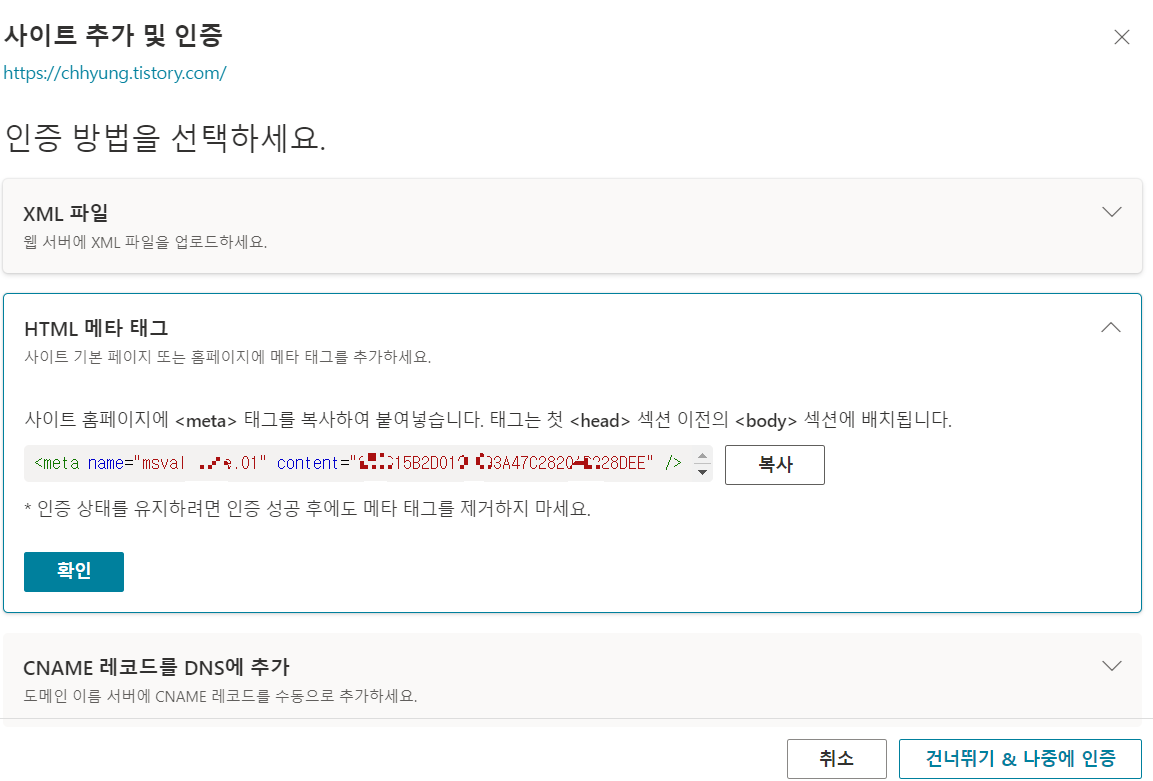 이렇게 사이트 추가 및 인증 사이트가 나오는데 여기에서 'HTML 메타 태그'를 click !!!!