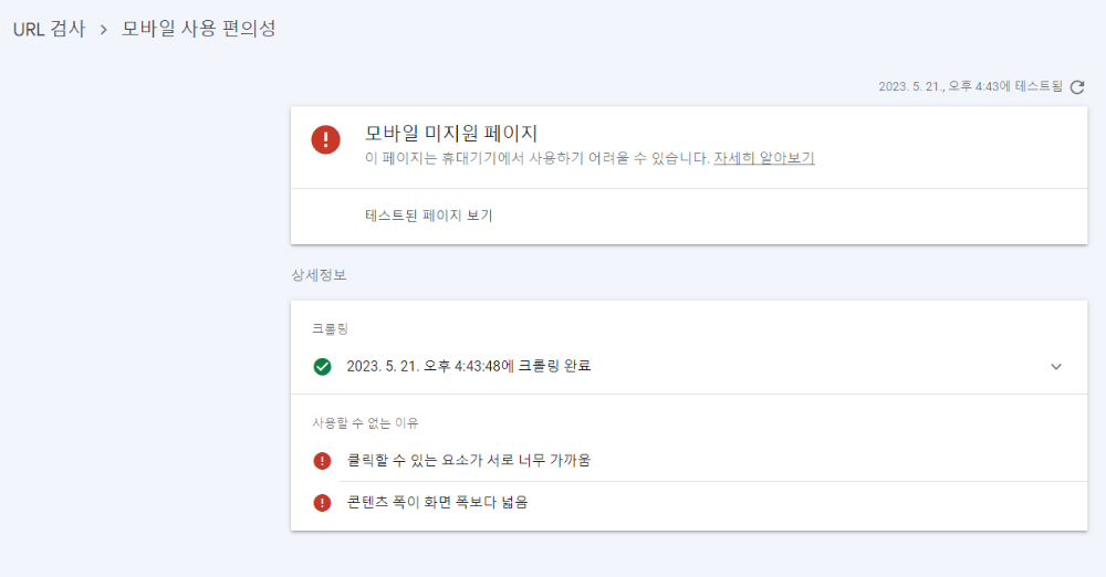 그리고 아래에 페이지 색인을 생성할 수 있느나 '개선사항과 환경'에서 모바일 미지원 페이지라는 것을 확인할 수 있다.