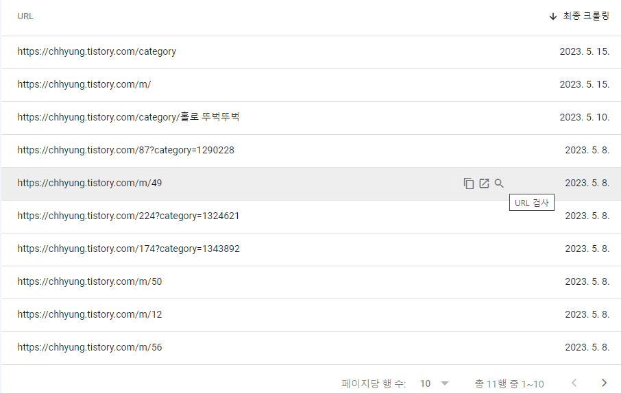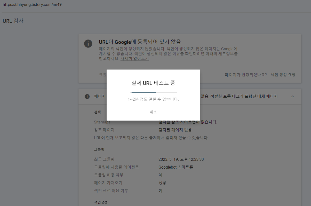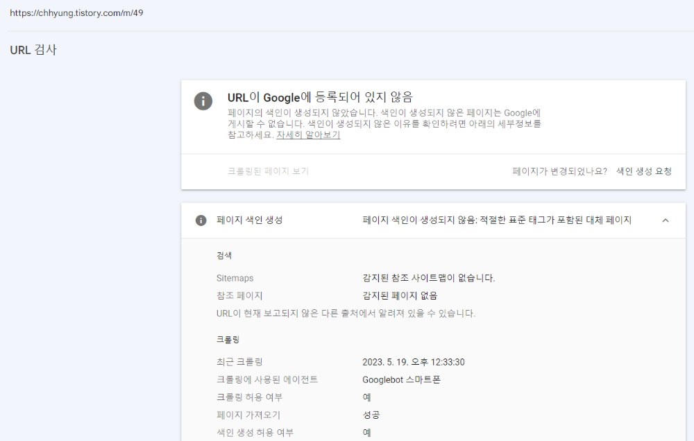 돋보기 부분을 click하면 위와 같이 'URL이 Google에 등록되어 있지 않음'이라는 문구를 볼 수 있다. 예전 포스팅에서도 말했지만 google은 색인생성이 되지않으면 google 사이트에서 확인할 수 없다. 여기에서 /m/은 모바일로 확인하는 경우이다.