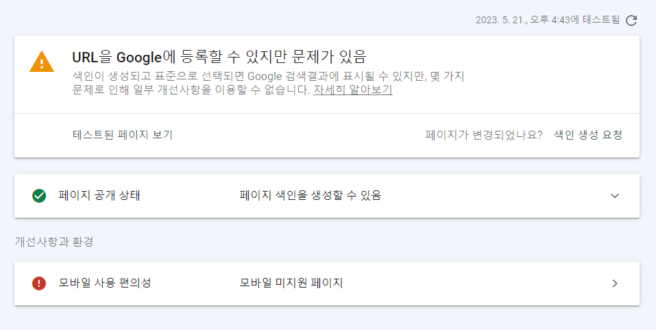 위와같이 URL을 Google에 등록할 수 있지만 문제가 있음이라는 메시지를 확인할 수 있다.