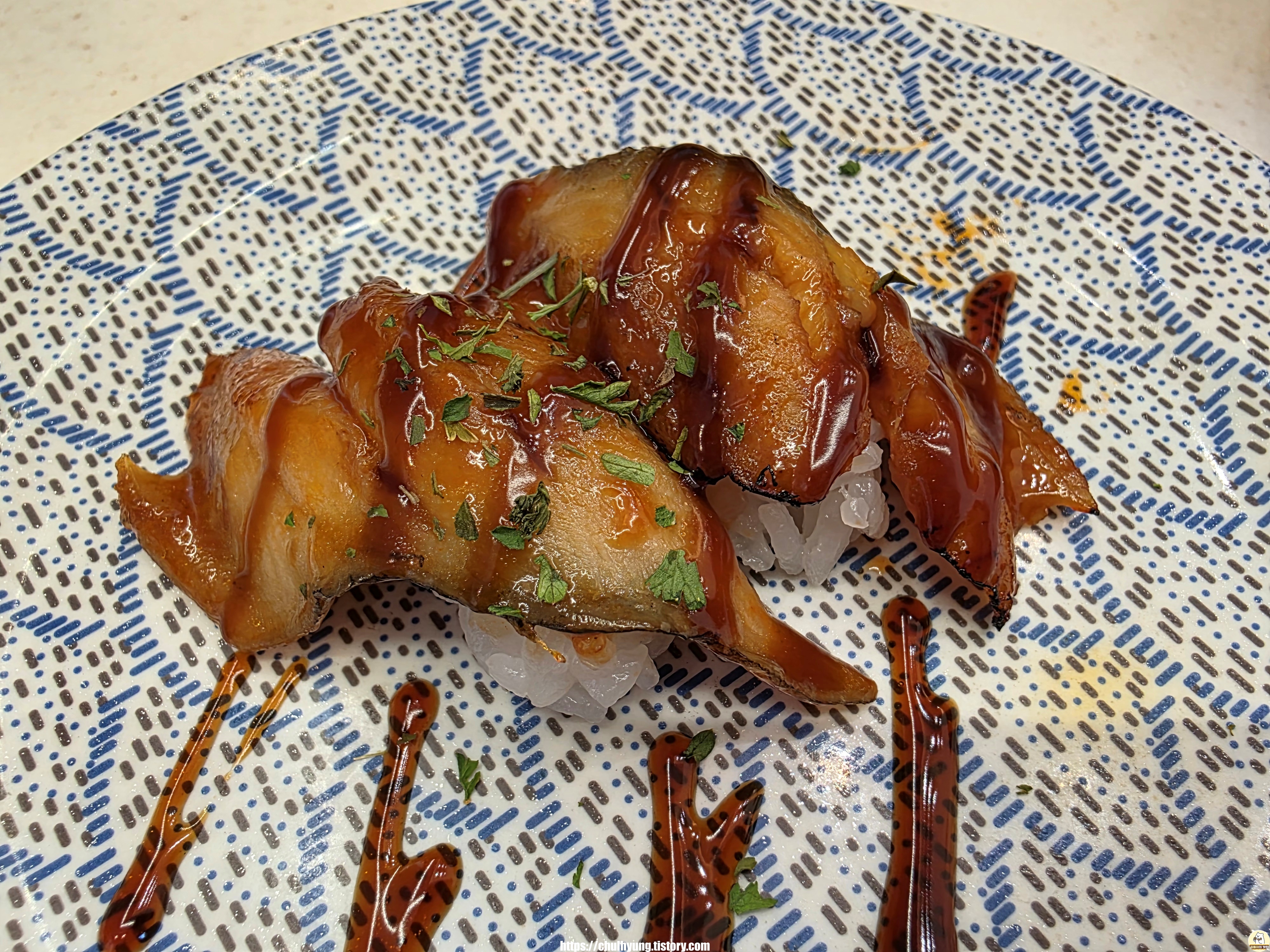 보통 초밥은 활어회나 숙성회등을 좋아한다. 이처럼 구이용 초밥은 신선도면에서 조금 떨어지긴하는데.. 뭐.. 맛이 없다는건 아니다.. ^^